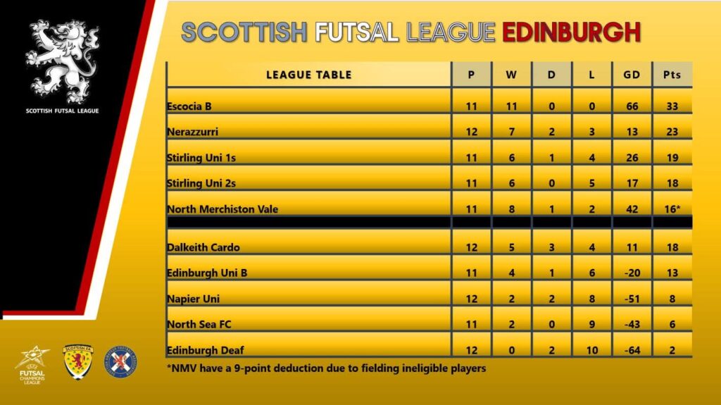 B Team: The B Team had no game last week but the matches played went in our favour to give us a really convincing gap at the top of the SFL Edinburgh table. We play 2nd placed Nerazzurri in an 8.20pm KO at the Oriam on Wednesday.